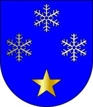 Shield Azure three snow crystals Argent, in base an estoile Or. Mural crown Argent with four visible towers (town rank) and white scroll reading in black upper case serifed letters "VALEZIM".