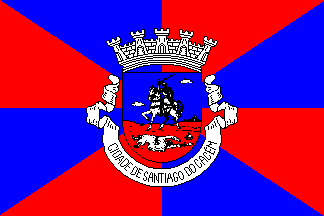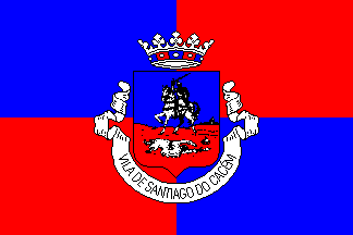 This coat of arms appeared until recently with unusual crown (ducal, with silver stems and alternating red and blue sides!) and shield shape (Samnitic/French). It was one of the few that remained unchanged in the 1935 municipal heraldry reordering, having been “standardized” recently, undoubtlessly, when Santiago do Cacém was upgraded to city rank and minor changes were introduced in the flag. Note the differences: quartered to gyronny and "VILA" to "CIDADE", usual when rank is upgraded, and standardized shield and crown. My source shows no clouds in the previous version, but that’s is probably only a variation. The background colours could have been standardized too — this is becoming quite often recently, as towns became cities and the Heraldry Institute (CHAAP) makes not only the expected changes from 4 to 5 towers and from quarterly to gyronny, but also some “corrections”. But though red and blue are an eye sore against the metal on tincture rule, there is no alternative with such a coat of arms, since monochrome backgrounds are currently being evitated by the CHAAP. I’d like to know why it wasn’t changed for good — other non-orthodox coats of arms (but not this unorthodox!) were changed in similar circumstances…