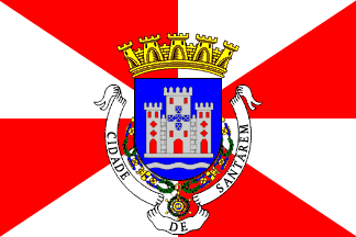 The coat of arms is azure, a castle argent masoned sable with windows and doors gules, charged with Portugal ancien, by a fess wavy argent. Collar of the order of the Tower and Sword. Mural crown Argent with five visible towers (city rank) and white scroll reading in black upper case letters "CIDADE DE SANTARÉM".