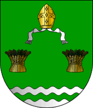 Shield Vert a mitre Or with lappets Argent and two wheat sheaves Or ordered 1:2, on base wavy Argent a bar way Vert.