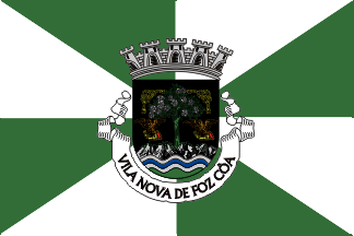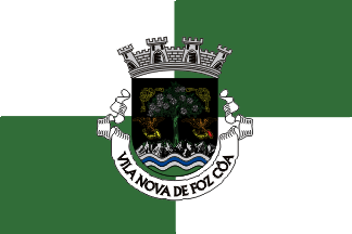 The arms are Sable and almond tree Vert flowering Argent issuant from a rocky mound Proper charged with a wavy fess Azure fimbriated Argent between two hunting horns Or dressed Gules each held by a hawk Proper cornered by two knots of rope Or in chief. Mural crown argent with five visible towers (city rank) and white scroll reading in black upper case letters "VILA NOVA DE FOZ CÔA."
