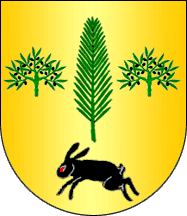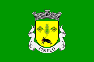 Shield Or, a palm leaf Vert set in pale between two olive twigs Vert fruited Sable, in base a hare courant Sable with eyes Gules. Mural crown Argent with three visible towers (village rank) and white scroll (Bénard Guedes style) reading in black upper case letters "PINELO".