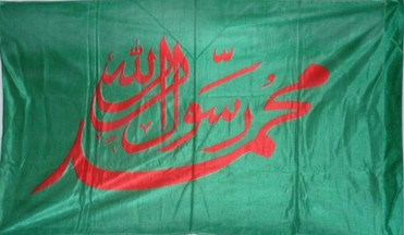 the messenger of Allah". Here, a green-field flag with white, easily readable