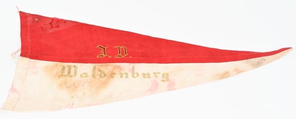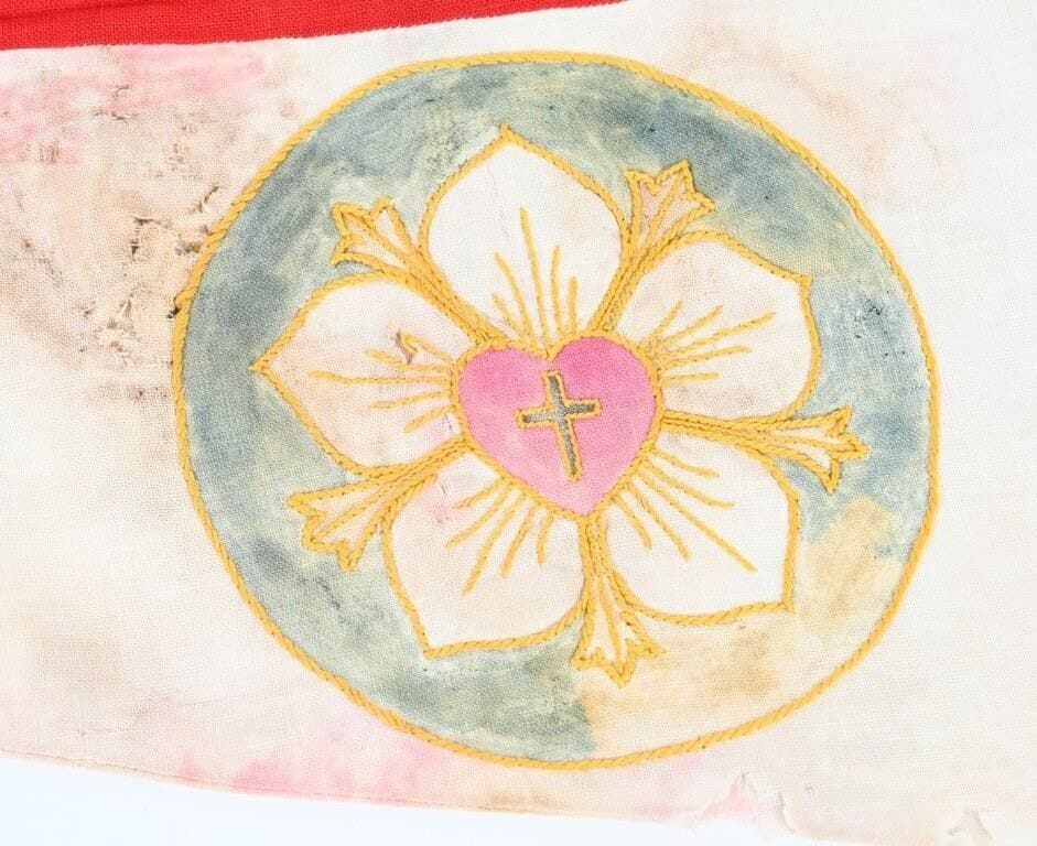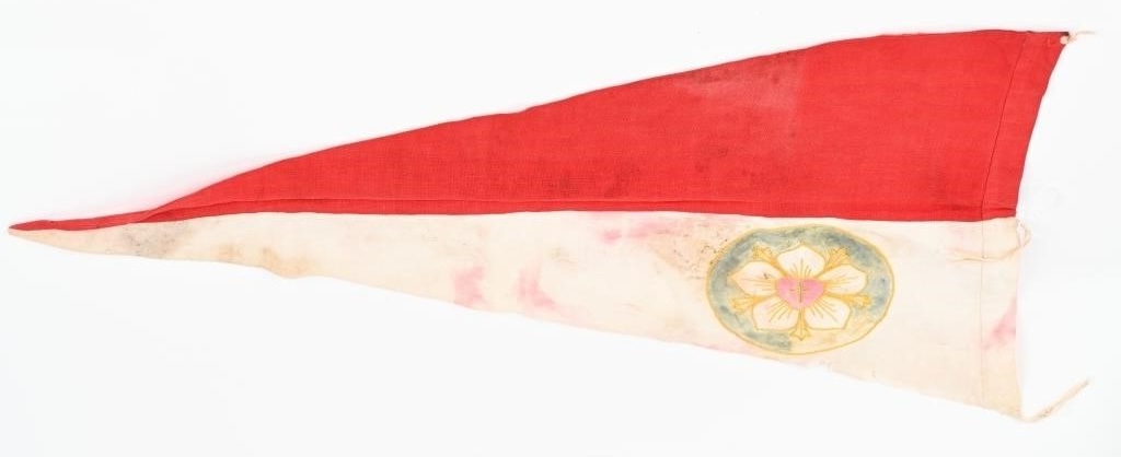 Caption: "Small pennant measuring 31×17 inches [79×43 cm] of a Pre Hitler Youth Lutheran Rose flag that is