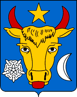 The coat of arms of the Republic is: a French shield Azure, an aurochs' head Or horned, eyed and langued Gules, having a five-pointed star Or between horns, a rose Argent on dexter and a crescent Argent on senester.
