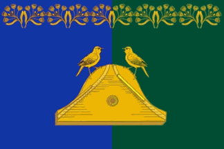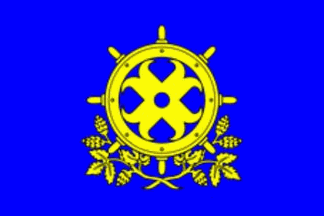 The flag is blue with a ship's wheel on a garland of hazelnut sprigs.