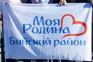 Biyskiy County in Altayskiy Territory is using an unofficial flag when is needed. It is white with a red outlined heart near the end, and a text in three rows "Moya / Rodina / Biyskiy rayon" in blue. Photo was seen on many photos on official Biyskiy County page in vkontakte.ru.
