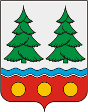 In a silver field, two stylized green spruce trees above a gules (red) wavy base, bearing three gold bezants and abstractly completed with azure (blue, light blue).