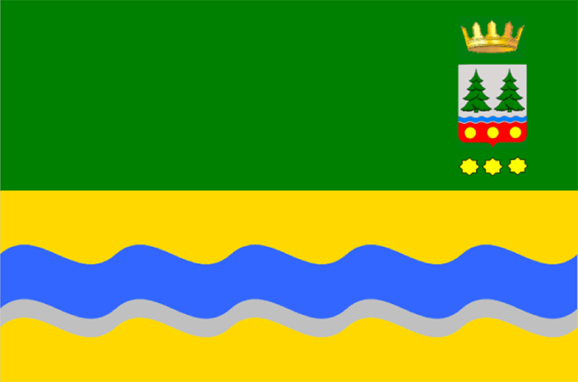 The 2011 flag is a rectangular cloth with a width to length ratio of 2:3, consisting of two horizontal stripes: the upper one is green, the lower one is yellow. The upper horizontal stripe is 1/2 the width of the flag, on its left part is the coat of arms, topped with a heraldic sign - a golden crown with five visible pointed teeth, symbolizing the status of a municipal county. Under the coat of arms are three golden eight-pointed stars. The lower horizontal stripe is 1/2 the width of the flag, divided in the middle by a blue (azure) wavy belt with a silver border at the bottom. The ratio of the width of the wavy belt to the width of the flag is one to six. The ratio of the width of the silver border to the width of the wavy belt is one to three.