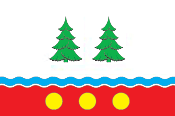 The 2014 flag is rectangular cloth with a width to length ratio of 2:3, consisting of three wavy horizontal stripes, from top to bottom, of white (2/3 the width of the cloth), blue (1/9 the width of the cloth) and red (2/9 the width of the cloth), with a thin thread-like stripe of white between the blue and red stripes; in the center of the white stripe are two green spruces; in the center of the red stripe are three yellow circles.