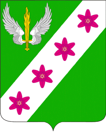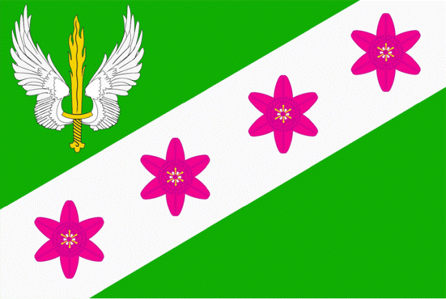 In a green field, a silver left band, burdened with four purple flowers of the curly lily (saranka) with golden stamens (visible from above), laid along the band and accompanied at the top by a golden flaming sword with silver raised wings.
