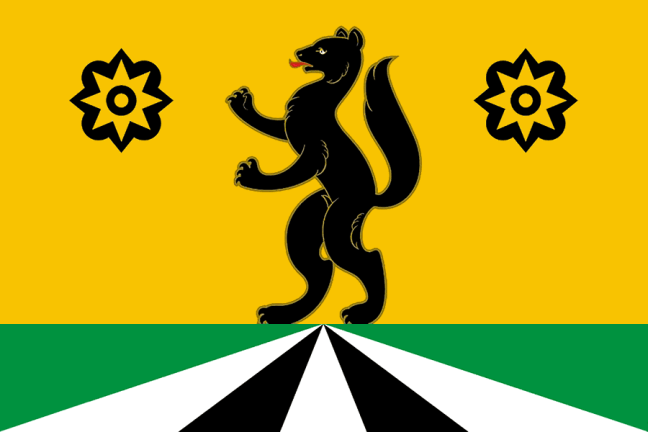 The district flag is a cloth with a width-to-length ratio of 2:3, and a composition of the district's coat of arms is spread across its entire surface, with the heraldic gold replaced by yellow and the heraldic silver by white.
