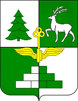 In a field divided into four argent and green, at the top right is an abstract spruce, at the top left is a walking deer, at the bottom are six bars folded in a pyramid (1, 2 and 3), all figures are of alternating colors; and on top of all - a golden key, ending at the bottom with a winged wheel, with a ring upwards.