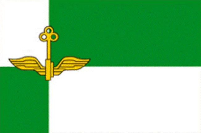 The flag is a rectangular cloth with a width-to-length ratio of 2:3, divided crosswise into four unequal parts: two white (at the top, near the flagpole, and at the bottom, near the free edge) and two green. In the center of the cloth is a yellow key with its ring facing upward, ending at the bottom with a winged wheel.