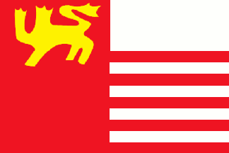 into red and white segments. The canton region is charged with a gold lion