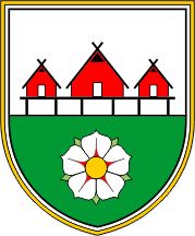 The coat of arms is "Per fess, 1. Argent three stilt houses gules the central higher, 2. Vert a rose argent seeded or".