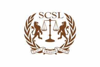 arms--two lions and a ribbon reading UNITY FREEDOM JUSTICE, with "SCSL" above it