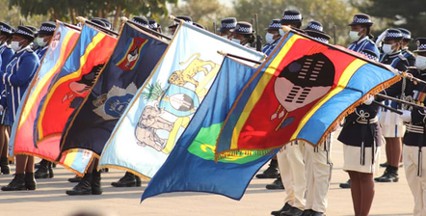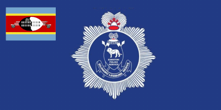 The flag of the Royal eSwatini Police (formerly Royal Swaziland Police) has a dark blue background with the national flag in the canton and the emblem of the police service, as illustrated below, outlined in white in the fly.