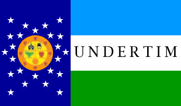 The flag is based on the 1999-2002 C.N.R.T. flag, with a dark blue hoist panel taking ~2/5ths of the ~3:5 flag and the remainder a horizontal triband of light blue, white and green. On the dark blue area a central circular device, yellow with wide orange rim, divided 2+2+1 by orange lines and containing on each of these five areas five things I cannot tell apart — black, black, green, red, and orange, and eight more things, red, on the border (better image needed!). This disc is surrounded by 23 five-pointed stars in a complex, vertically symmetrical arrangement. On the white stripe, the word "Undertim" in black serif capitals.