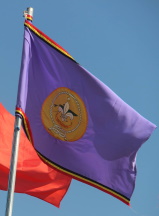 The Scout Association of Timor-Leste (UNE-TL) was formed in 2005 and was recognized by the World Organization of the Scout Movement in 2007. The flag of the organization is their badge in the middle of a purple flag (universal scouting flag). On the top edge of the flag, there appears a stripe of red/yellow/black, with that order being reversed for the bottom edge.