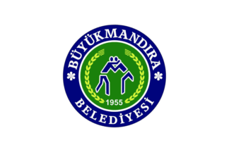 The flag of Büyükmandıra, used horizontally or vertically (photo), is white with the municipality's emblem. "Belediyesi" means "Municipality".