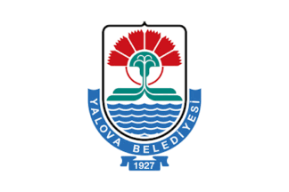 The flag of Yalova is horizontally divided red-white by a a wavy linbe, green at the left and blue at the right, and charged with the municipality's emblem. The former flag of Yalova (photo) was white with the municipality's emblem. "Belediyesi" means "Municipality".
