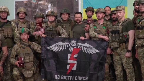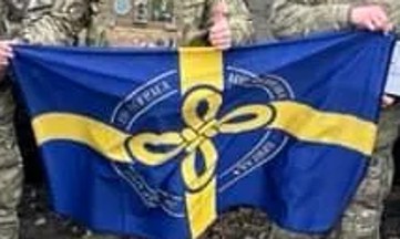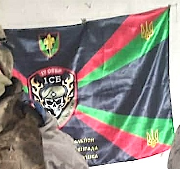 The Khortytsa operational-strategic group of troops of the Armed Forces of Ukraine operates under the same flag. This photo was taken on the occasion of a visit by President Zelenskyy in the region of Bachmut on 26 June 2023 (info source, photo source).