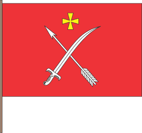 "In the middle of red rectangular panel with a ratio of the sides as 2:3 is white crossed sabre and arrow edges up accompanied in the top by yellow formy cross."