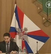During a report upon the Crimea Crisis a Russian Flag could be seen. Ratio like national flag, i.e. 2:3, design similar to the Defence Ministers flag, but with silver double-eagle and without fringes, red disc and wreath. So my first guess is, it has something to do with the ministry of defence.