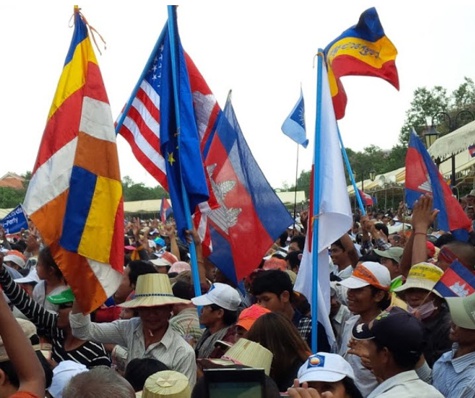 The photos at the above Wikipedia page show the flag (incompletely viewed) among the flags of Cambodia National Rescue Party which, together with the fact that it bears an inscription, suggests that it is actually a political flag, probably created during the protests.