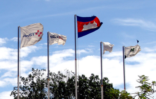 Anyway I believe all these flags are corporate flags of the various companies controlling and operating the airport. Unfortunately, I can't make out all the flags clearly enough to be sure, but from left to right I'd agree that it would go Vinci, SCI, Cambodia, "unknown", and MMC.
