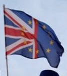 Two other flags are created by "marshalling by dimidiation" of the UK and EU flags. Version with the hoist half of the UK flag and fly half of the EU flag can be viewed here. Note how the dimidiation was not precisely done (star cut by the partition line) - the flag is obviously homemade.