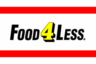 "Food 4 Less" is a US chain of grocery stores, the low-end counterpart of Ralphs grocery stores (both owned by the Kroger Company.) A nearby one (on S. Bristol St in Santa Ana) flies its flag off its rooftop, in sort of an "Israeli" format with red stripes and the unsightly corporate logo in the center, comprising the text "Food 4 Less" with the 4 yellow and the rest black.