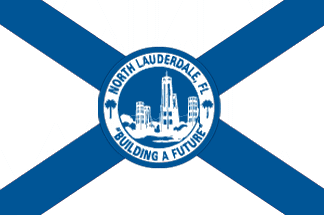 The flag of North Lauderdale is a blue saltire on white with the seal centered.