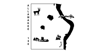 Archived copies of the pages about Cherokee County are still at web.archive.org/web/20030403211203 and web.archive.org/web/20030628191007. It is a ~5:9 plain light (white) flag showing a large, mostly empty, emblem drawn in a single darker shade. This emblem shows a voided outline map of the county with the Mississippi River, along its eastern boundary, in solid dark color - the other three boundary lines are orthogonal straight lines. Along the western outer edge of the map, the writing "Allamakee 150", referring to the county's sesquicentennial anniversary, set vertically but with straight up letters in dark bold sans-serif capitals. On the map itself several landmarks are placed, seemingly on the locations they refer to: