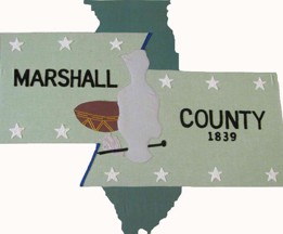 were chosen. The central figures are artifacts taken from the Steuben Township site by Dan F. Morse, anthropologist. The bird effigy of valuable blue-gray flint is a nearly perfect specimen as is the bowl, a prize find. The swan bone was used to punctuate the bowl. These artifacts represent a culture of our county from 500 BC to 580 BC. Hopewellian Indians had attained a very high culture of the fine arts. The arrowhead tells of a period 500 years later. From this great ancient American culture of the Hopewellian Indians, the State of Illinois came into being. Marshall County was formed in 1839. In the flag you see an outline of the boundaries of Marshall County superimposed upon a silhouette of Illinois. The living green color of the county background represents our many growing crops. The twelve white stars denote our twelve townships; Saratoga, LaPrairie, Whitefield, Steuben, west of the Illinois River; Hopewell, Lacon, Richland, Robert, Bell Plain, Bennington, and Evans, east of the river. The design is well balanced due to the shape of our county and the fine work of artist Wilda Russell of Wenona.