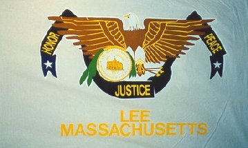 Lee is in Berkshire County, western Massachusetts. The flag is white with an eagle wings outspread and a dark ribbon behind bearing the words HONOR JUSTICE PEACE. The town seal is below the eagle's right wing. The town and state name are