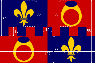 The specifications define a construction grid of 88:132 (=2:3), with rings and fleus de lis inscribed in 36x36 imaginary squares and the crenellations in a 12x12 one.