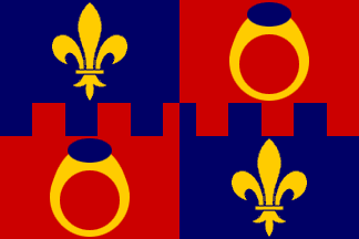 Height to length, 2 to 3. The flag will be quartered by a crenelated line, separating the top two quarters from the two bottom quarters, and a straight vertical line, separating the left two quarters from the two right quarters. The upper left and lower right quarters shall consist of a gold fleur-de-lis on a blue background. The upper right and lower left quarters shall consist of a gold ring with a blue gem on a red background. Crenelated line formed of 11 squares, 1/11 of flag length, with center block split in middle with left side red and right side blue. Rings and fleur-de-lys to be three times as high as a block in the crenelated line with width proportional. Rings and fleur-de-lises centered horizontally on their quarters and spaced vertically so that upper and lower edge of rings and fleur-de-lys are equal distance from horizontal outside edge of quarter and nearest part of crenelated line. Red and blue should be the same shade as is used in the United States flag and gold should be same shade as is used in the Maryland State flag.