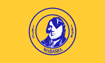 The flag appears to show Wapasha II, a Mdewakanton Dakota chief who lost an eye in a lacrosse accident (and covered the wound with this hair) and signed a treaty with the US government in 1830. A final treaty was signed in 1858 by his son, Wapasha III. The city is named for these two chiefs and the earlier Wapasha I.