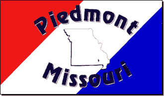A red-white-blue diagonal tricolor with a map of Missouri and a spot indicating the town's location. Arched above and below the map are PIEDMONT and MISSOURI.