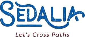 The previous flag of Sedalia, used before the flag adopted in 2021, was the city's name and date of establishment in gold over a tilted, partial light blue city seal on a dark blue field.