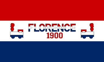 The flag is horizontally banded red-white-blue with the name and two railroad engines similarly banded on the white stripe.