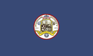 The prominent image on this flag celebrates Putnam's 2012 bicentennial: Two American flags - the one flown in 1812 and in 2012 - are shown. An image of the county's famous courthouse and its namesake, General Israel Putnam, sit inside the shield. The three circles are the original county seal (on the left), the current seal (on the bottom), and a War of 1812 soldier's grave marker (on the right).