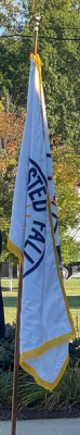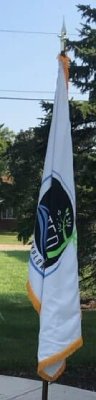 Hello. There are two flags of Olmsted Falls that I found. The first one is a white background with the logo of Olmsted Falls in the middle. The second one is also a white background but this time it has a seal of Olmsted Falls.