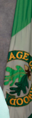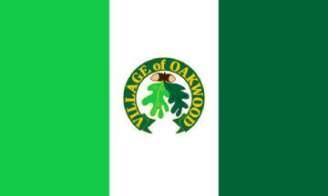 The flag is a vertical tribar of light green-white-dark green. In the center is a seal like emblem which shows the village's name in gold inscribed on a dark green banner which arches over oak leave with acorns on top of them.