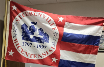 The Steubenville Bicentennial Flag consists of two halves, on the left is a red field with the bicentennial seal centered in it, on the seal is says "STEUBENVILLE" on top and "BICENTENNIAL" on bottom with stars in between the word's gaps, and in the middle is a replica of Fort Steuben. In each corner there is a white five-pointed stars. The right side has six stripes that alternate red, white, and blue. Image sent by the City of Steubenville.