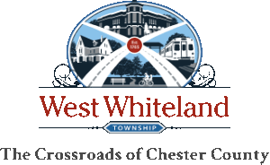 The flag is a white field with two thin light blue bars on the top and bottom of the flag, and centered with the township logo.