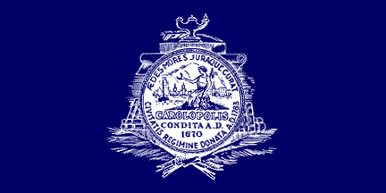 American City Flags records an earlier version of the Charleston flag. The seal here has been amended to reflect that extant in 1882. A good example and some details about it can be found at www.charlestonfootprints.com/charleston-blog/enlightening-latin/2014/01/28/. A very informative history of the seal, "The Seal of the City of Charleston" can be found at www.charleston-sc.gov/DocumentCenter/View/4251.