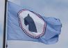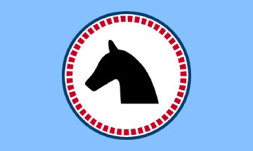 The flag is made of a blue field with a white circle and dark blue outlines. A ring of disconnected squares make a sort of inner border. In the center is the head, and some neck, of a horse, which is indicative of the ranch feel of the subdivision.